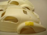 問題はレジンの回りの悪かったボディーをばらした代物だが、多分、昔読んだCGか何かのアトランティークの読み物の中に出て来た、列車と衝突し大破した車をレストアした車を作ろうと思っていたのだと思う。 その記事の中の写真では、リアの処理がモーガンの様にフラットに流れ落ちていて、通常のアトランティークよりも私には非常に魅力的に見えた。 多分当時の色は黒だったと思うが・・・?! ・・・その車を作ろうとフロント・ウイングを切り離しリアに持ってきているのだが、既に記憶も飛びかけているので、これから少し調べてみようかと思う・・・。