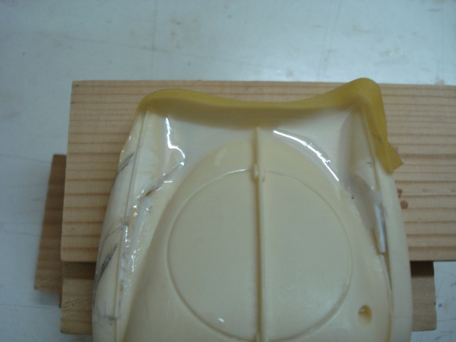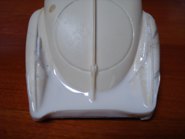 流し込んだ後は感覚で、リアを蒲鉾の板でフラットになる様に持ち上げて固まるの待ったのだが、その間に微妙に角度調節をしたせいか、表面張力のせいか、センターのトランク部分の境界がダルになってしまった。 サフェの前に多少は修正したのだが・・。