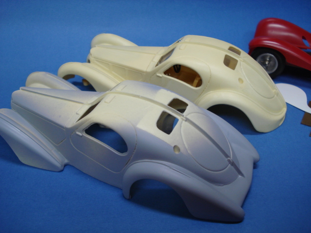 この車で一番問題になったのが、リアエンドまで流れる綺麗なラインの製作方法だ。 いろいろ考えてはみたのだが・・・、今回は、継ぎはぎの穴の開いた部分を内側から粘土で塞ぎ、エンド回りをテープで止めて、大胆にも同じメーカーの古いレジンを流し込んでみた。 ボンネットサイドのメッシュ張りのエアー抜きの開口部も、同じ方法でレジンを流し込んで塞いでいる。(上手く行けばの話だが・・、パテ盛りよりも楽だ!)ただ実車のラインは、この写真よりもフラットにリア・フェンダートップまで一気に直線的に上がっている様に見える・・・。