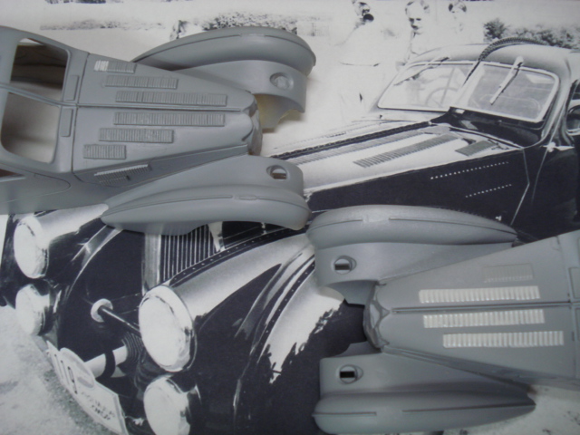 最大の懸案事項がこのボンネット上のルーバーだ~・・・。 試験的に0.14mmのプラ板でバキュームしてみたり、モーガンのルーバーをレジン取りしてみたり・・・。 ルーバーの幅や間隔の問題もあり、未だに決定打を見つけ出せないでいる・・・。