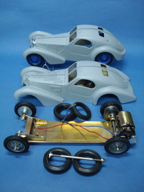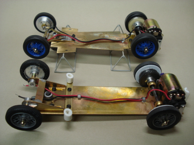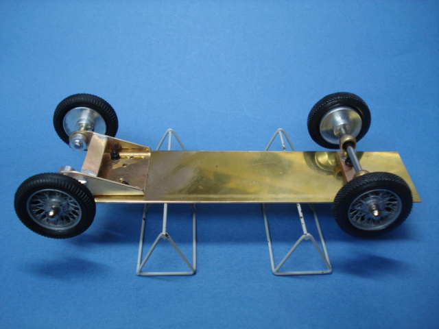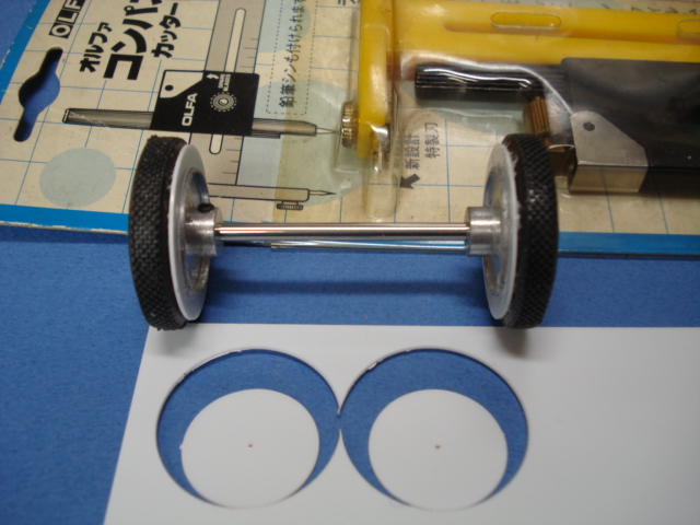 こまごました工作のはじめは、8本のタイヤの接着と芯出しなのだが、エレールの細いジャンクタイヤを使った2台目のシャーシーのリアタイヤの補強は0.5mmのプラ板を内側に接着してみた。 細いし古いしでホイル面だけの接着ではパワーを掛けたときに広がりそうだったのだがこれで多少は安定したし、面取りも問題なく行えた。 後で目立たない様に黒く塗るつもりなのだが、細かいことを云えば接着剤の偏りによるホイルバランスがどうかと云う事だが・・・。(笑)
