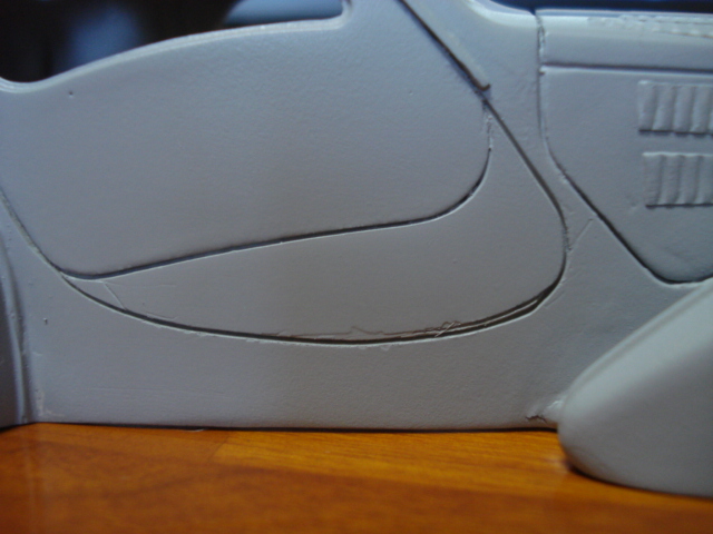 数日前に、型紙(薄いプラ板)を作ってテープで固定して引いた罫書きがまたまた脱線してしまい、今晩にでも修正のパテ盛りをしなけらばならない羽目に再び陥っている。(小さなRの部分の罫書きは本当に難しい。) 先にドアの上のサッシを貼ってしまったのがそもそもの手順違い。 ・・・おまけにオリジナルの仕様とは違ったパーツもあるので、どう製作したら良いものか?と、未だに試行錯誤・・・。
