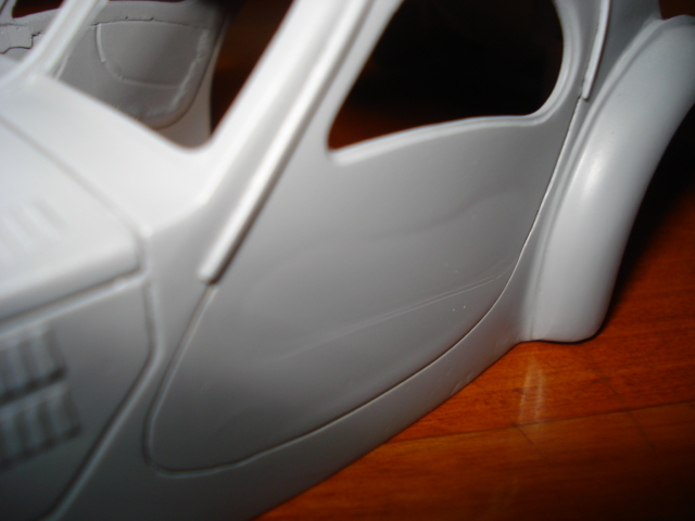 パテ盛りの削りだし中に、危惧していたドアのサッシも一部剥いでしまったが、どうにか上手く再接着することが出来た。 でも何回もサフェを噴いているので、ボディー細部のシャープなラインは大分失われてしまっている。