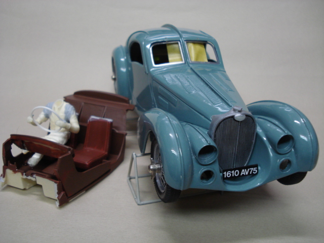 ドライバーも大きなハンドルを持たせなければいけないし、作り置きのレジンの人形の膝下が足らず追加したりと、結構苦戦している。 この車のドライバーにはヘルメットはいらないので、これもやはりどこかから普通の合いそうなヘッドを探し出してこなければならない。 内装の色も、もう一度剥離して塗り直さなければダメな様だし、シートの形状にも目をつむるしか無い様だ・・・。