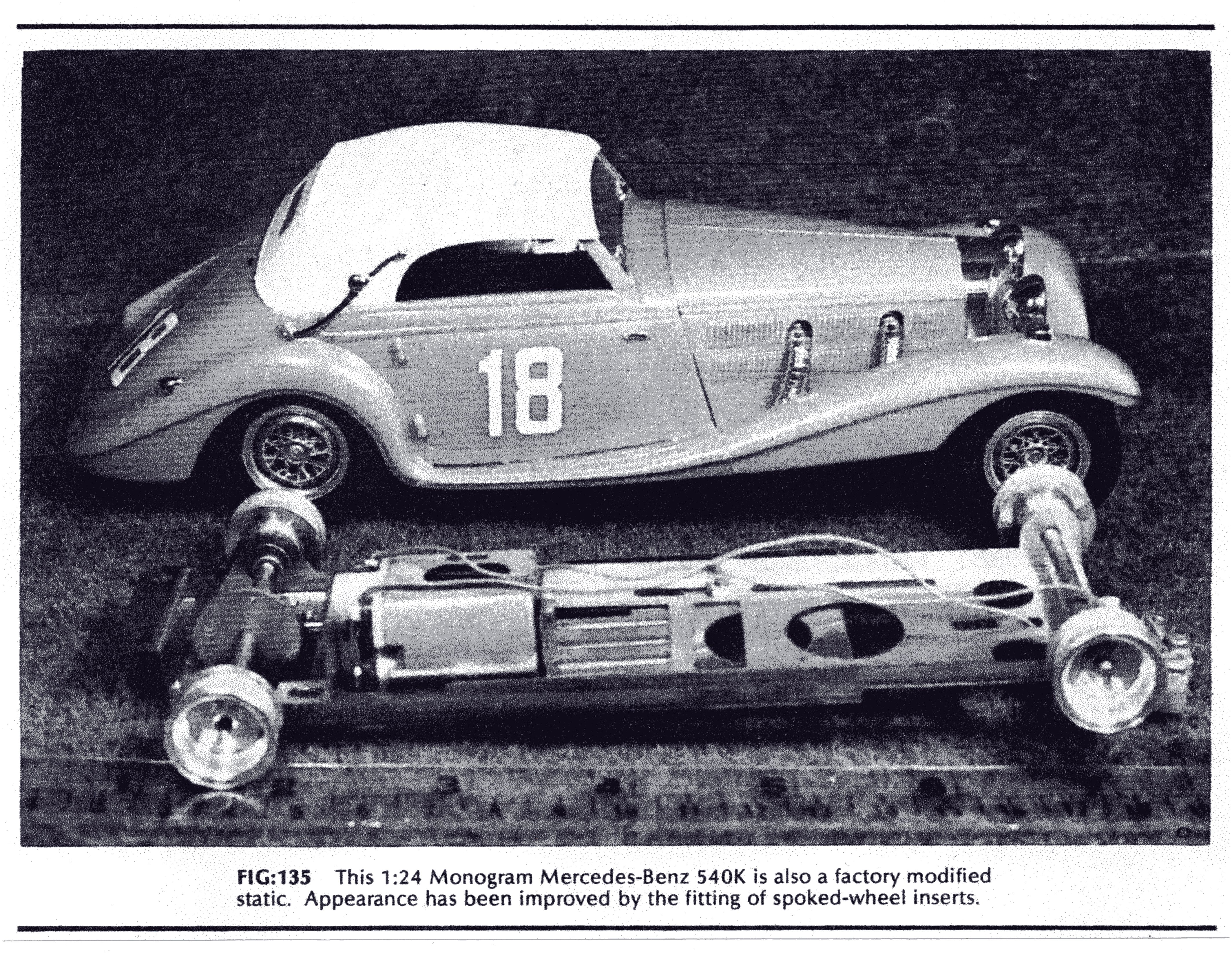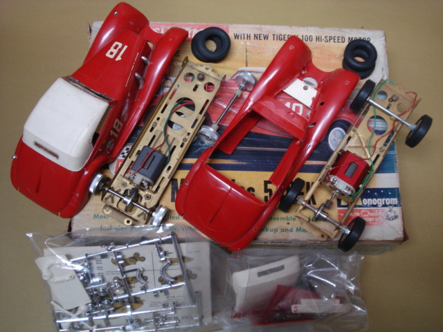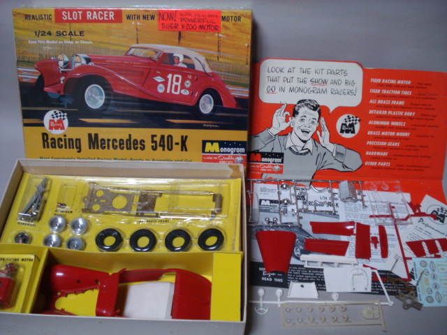 1964~5年のスロットカーの爆発的なブームにいち早く便乗しようと製作されたこのMonogramのメルセデスやデューシー等は、後のスロット・カーの本にも書かれているが、スロットカーには確かに不向きな車種だったと思う・・・。 60年代のレースが盛んなアメリカにおいて、30年代の超高級車(レースカーではなく、ブルジョアのステータス・カー)が当時の若いスロットカー・フリーク達に受けたとは私にもとても思えない。 なんでモノグラムはこんなクラッシックカーのスロットカーを即席で販売したのか?、私の中でもヴィンテージ・スロットの7不思議の一つに数えられる気がする。 もっとスロットに向きそうなスタティック・キットを沢山抱えていたのに何でだろ~・・・?!