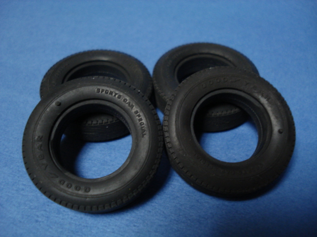 これも長年眠りについていたモノグラムのデューシーだが、キットをすんなり作ればこんな感じなのだが、やはりホイルが物寂しい。 右はメルセデスのスタティックのキットのホイルとタイヤだが、このワイヤーをオリジナルのホイルに入れるのは至難の業だ。 削り出したら殆どリムの部分が残らず、ワイヤーだけになってしまう・・・。 皆さん、どうやってインナーを取り付けたんだろう・・・???