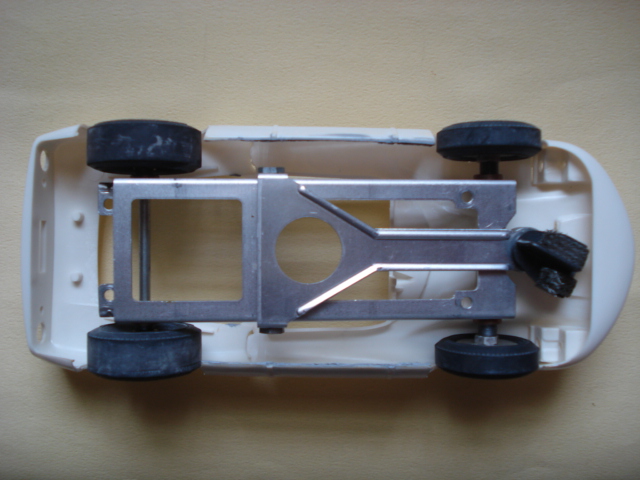 特にCarreraのリアのボディー幅は67、5mm程で、広いHusseinでも74mm程だ。 言い方を変えれば、このSWシャーシーにはカレラのボディーだけは、リアの幅が特に狭すぎてミスマッチだったと云う事だ。 ちなみに、スーパーギアをそっくり抜いて、1mmのスペーサーを両側に入れて、タイヤ・ホイルだけをナット留めした状態で丁度トレッドが合うという塩梅だ・・・。 (多分、幅が無い McLaren Ford も同じ憂き目を見る事になると思うのだが。)