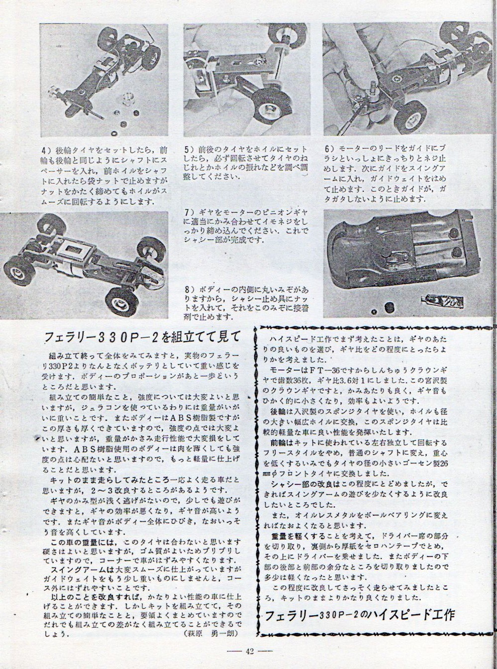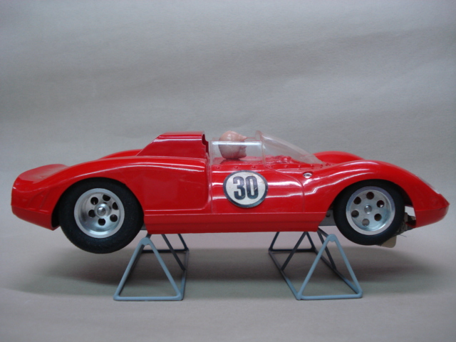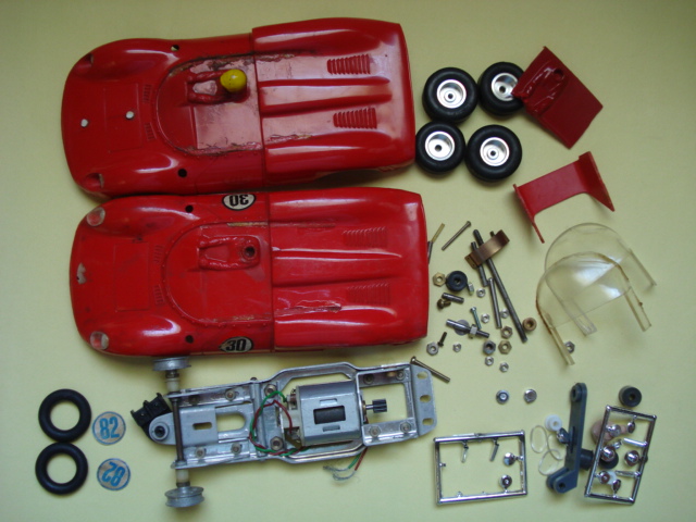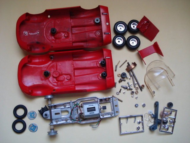 ・・・いつも思うのだが、実車の改造や修復(レストア?)と同じで、やろうと思えばシャーシーを部分的に切り飛ばし、モーター、スーパー、ピニオン、ホイル、タイヤ等すべてに手を入れる事は実車以上に簡単だ。 モーターも小さいものに換えればスーパー側のシャーシープレートを内側に移動させる事も可能なのだ。 ・・ただ、何でもかんでも手前味噌でいじくりまわしてしまったのでは、今まで作って来た古いモーターを積んではいても、ボディーが現行のレジンだったりの中途半端なスロットカーと同じになってしまう。 実車と同じで、タイヤや欠損した外装パーツやブラシ等の消耗部品は交換しても、基本構造に手を入れるのは、果たして古い車のレストアと云う観点から考えると、いかがなものか?といつも考えさせられている。 特に古い希少なスロットカーをいじる時には悩むことが多い・・・。