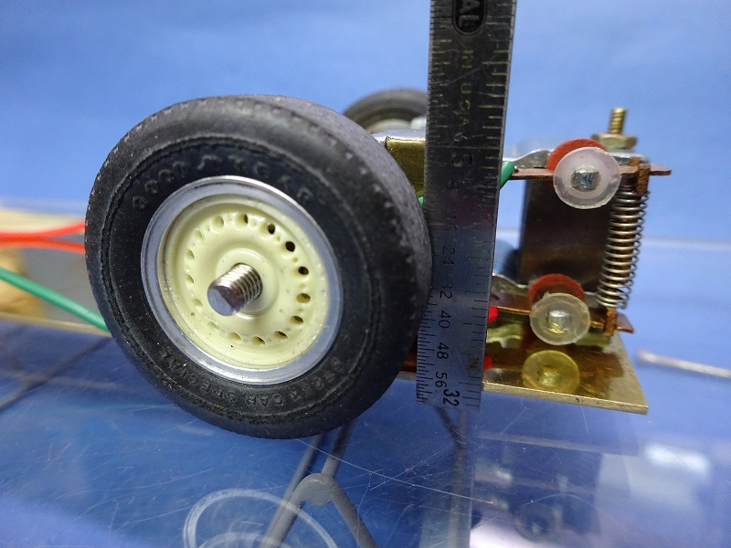 過去に製作途中で投げ出してあった Ford Galaxy の Ram DC706 使用の自作シャーシーの事をすっかり忘れていた私も悪いのだが、この2種類のモーターは、タイヤ径が28mm以上の車でなければ、吊り下げ方式をとる以外、使うのがなかなか難しいモーターであると云う事を知っておいた方が良いと思う・・・。           (一番最後の写真が、真鍮フレーム上にこの2種類のモーターを搭載した時のシャーシー・クリアランスを表したもの。)