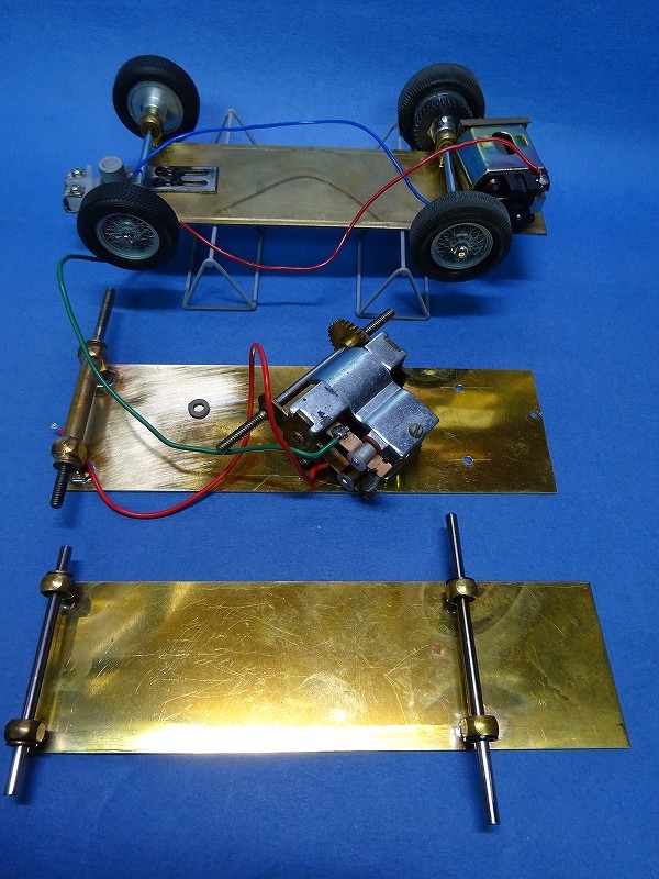最初に作ったシャーシーには16Dを載せたので、後の2台は違ったモーターを載せてみたいと思っていたので、今回は今まで使った事のなかったリアシャフト、スーパー 一体の Strombecker – Devastator モーターを1台に搭載してみた。 過去には Pittman DC706 (Ram DC706) を使ってFord Galaxy や JAGUAR D-Type を作っているのだが、今回のデベステーター・モーターでもクリアランス(clearance:車高)が取れなくて、こちらももう一苦労させられそうだ・・・。