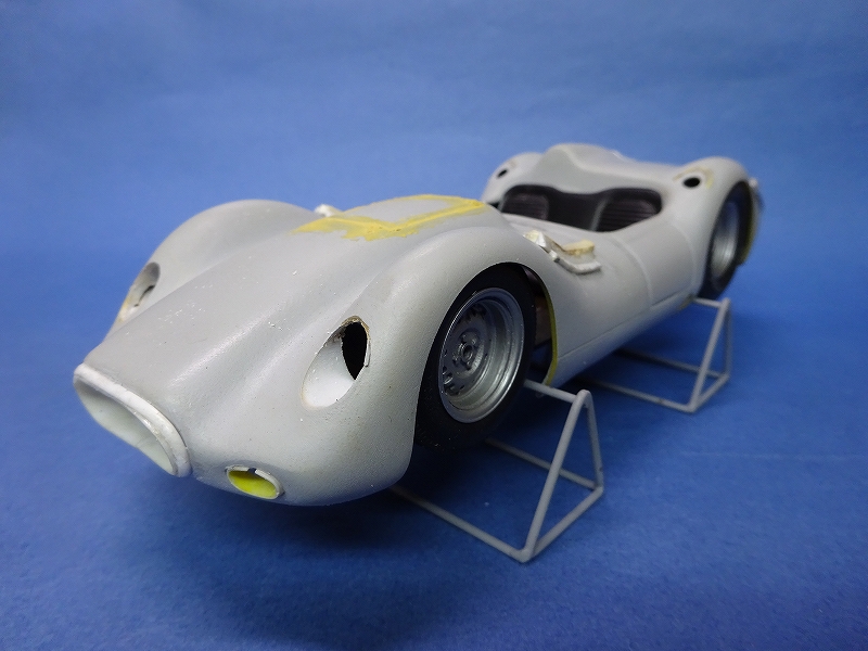ラスキットのリスターはご覧の様な状態で、残り物のプラ板やプラ棒を小学生の工作の様にやたらと張り付けてボディー修正の基礎段階を行っている。 プラのバキュームのボディーだからできる荒業だが、これがレジンのボディーではこうはいかない。    レジンのボディーでは接着剤は効きづらいし、同じメーカーのレジンを溶かしてかけるか、パテを盛るしかない。 スロットカーのボディーでは大量のパテ盛りは、ちょっとしたクラッシュでもすぐに”ポロリ”と剥がれ落ちてしまう事が多い。 その点、プラのボディーはプラスティックを貼ることが出来るので、ある点で云えば、便利である。      ただし今回使った溶着材は、あまり使いすぎるとレジンと同じで、張り込んだ側に時間の経過とともに引けてくる事が有るので要注意だ。 ・・・この後にプラ板の隙間を利用しながら、パテを盛ってペーパーで修正しようと思っている。 リア・モーターでリアにパテのてんこ盛りでは、相当のテールヘビーの車になりそうだ~・・・。(苦笑)