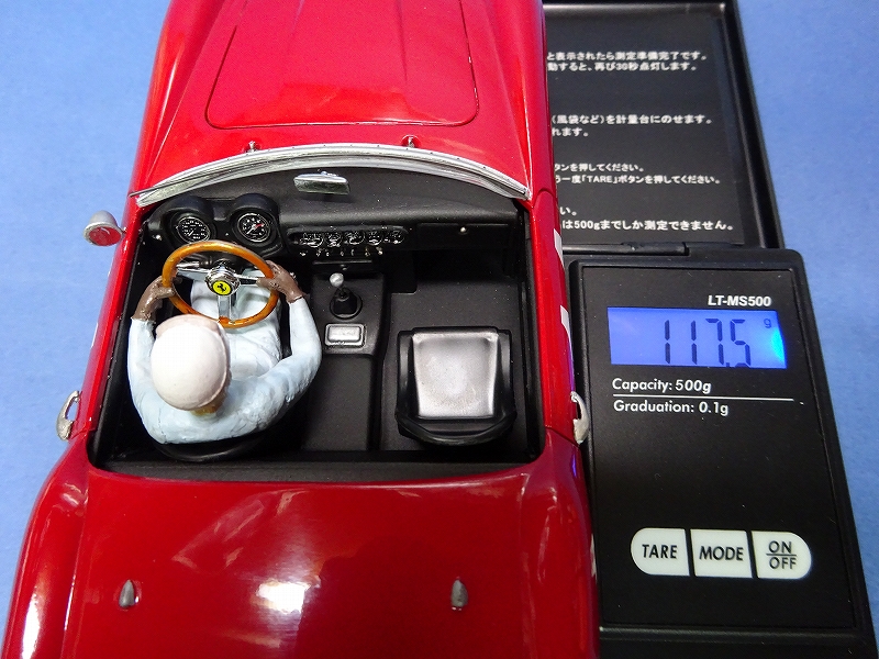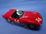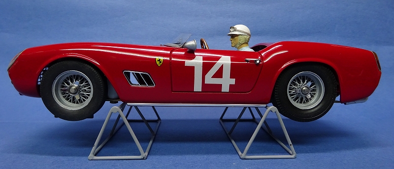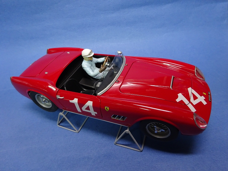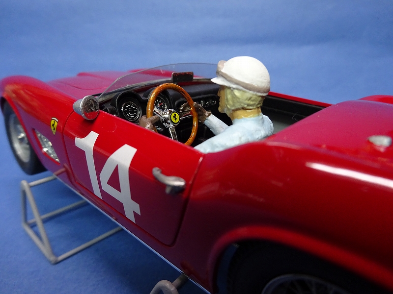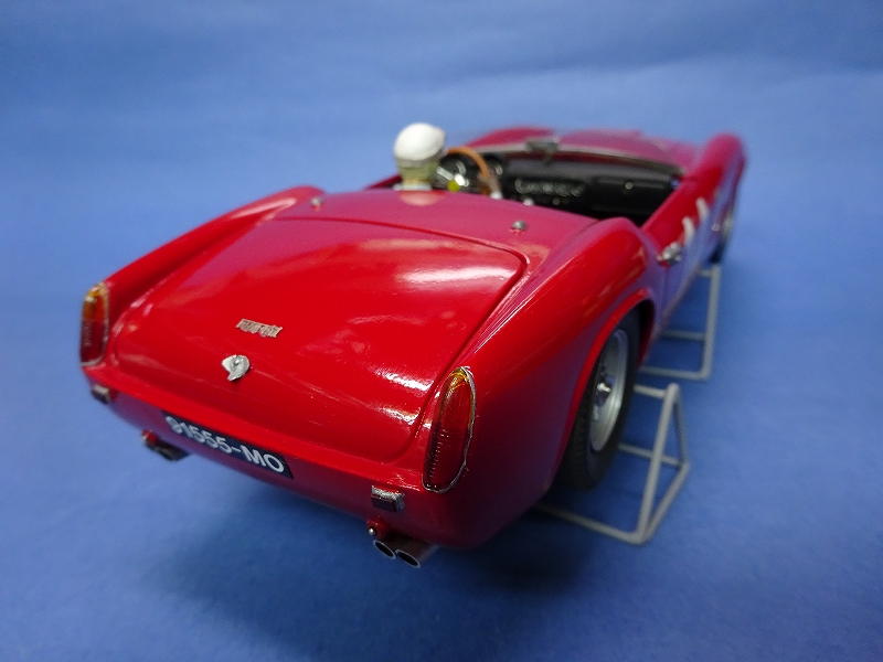 今回UPした50年代の 250 GT-California は、前回その生い立ちを簡単に書いた通りの放置車両である。 ・・・とりあえず、昨晩遅く形になったばかりだ。 出た当時に嬉しくてすぐに手を付けて実車とは全く関係のないゼッケンを入れたりしてボディーだけは大体完成させていた。 しかし“ITALERI”とは名ばかりで、スクリーンのフレームとスクリーンの合いが悪かったり、リア・トランクのオープナーの形状が大きすぎて、フィギュアが持つ扇の様でもあったし、何よりフロントとリアのライトカバーやランプのリムのシルバーの表現に迷い、止まっていた車なのだ。 当時ドアのハンドルの片方も折ってしまっていた・・・。 模型を作る人の感性にもよるのだろうが・・・、やはり好きな車種で「イタレリつくせり」のキットにはなかなかお目にかかれないものだ・・・。(笑)