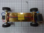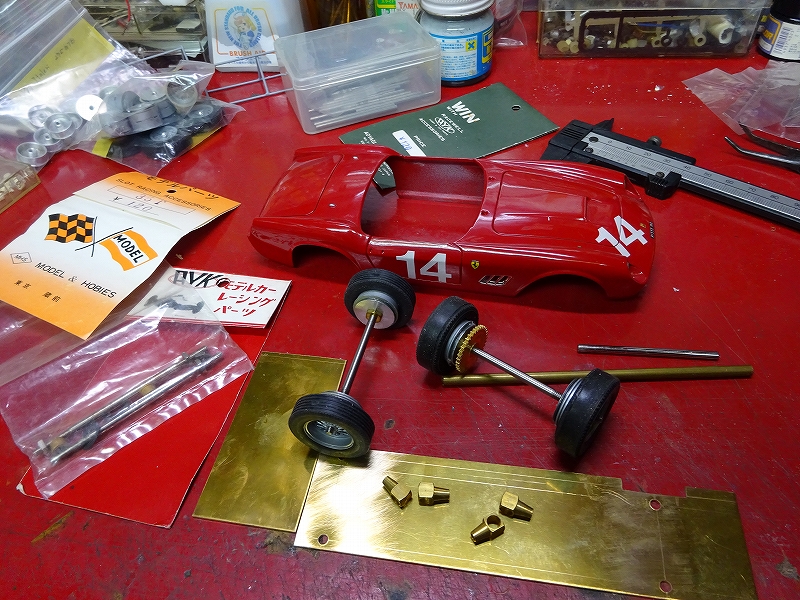シャーシーはご覧の様ないつもの1mm厚のブラス板を切り出して、古い自作シャーシー用のパーツを軸受けに使い簡単に製作している。(実は最初の計測とは微妙に違ってしまったらしく、フロントの軸受け部分は後で少しホイルベースを広げる工事をしなければならなくなってしまった・・・。涙) モーターは何とかFT-16Dのエンドベル・ホルダーの一部をカットして、アングルでリアに搭載してみたのだが、ピニオンをブラスに変えると音がうるさくなるので、現行のピニオンの穴を広げてとりあえず付けている。 マウントには残り物のサカツウの段付きネジを使用している。
