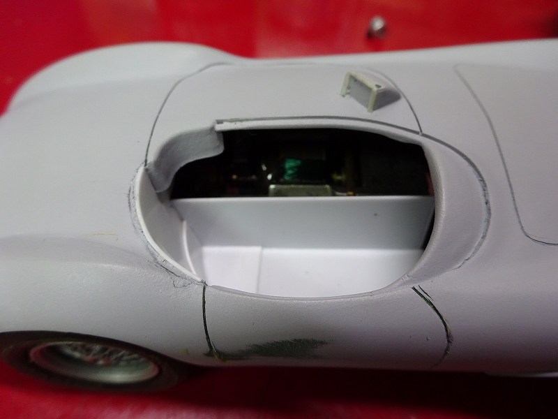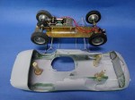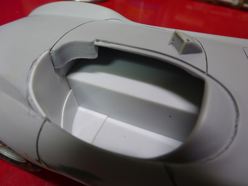 最初の写真は放置状態で箱から出したばかりのもの。 とりあえず、サイドに寄せて搭載したモーターをどうにか隠せる様にして、ドライバーが搭乗できるようにプラ板で内装を製作。 フロントアーチのフェンダーも付けるか付けないか?悩んだ末に、三角のプラ棒を成形して取り付けてしまった。 ・・・これで作る車も大分絞られてくる。
