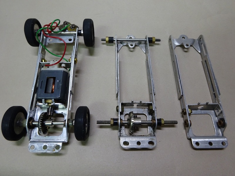 シャーシーの写真はコグレのシャーシーを初期型、後期型、レヴェルのラダーシャーシーと並べたもの。 コグレの初期シャーシーに16Dが搭載されているのは、既にシャーシーのモーターマウントの穴が大きくされていたジャンクシャーシーだったので、あえてFT16Dを載せてある。