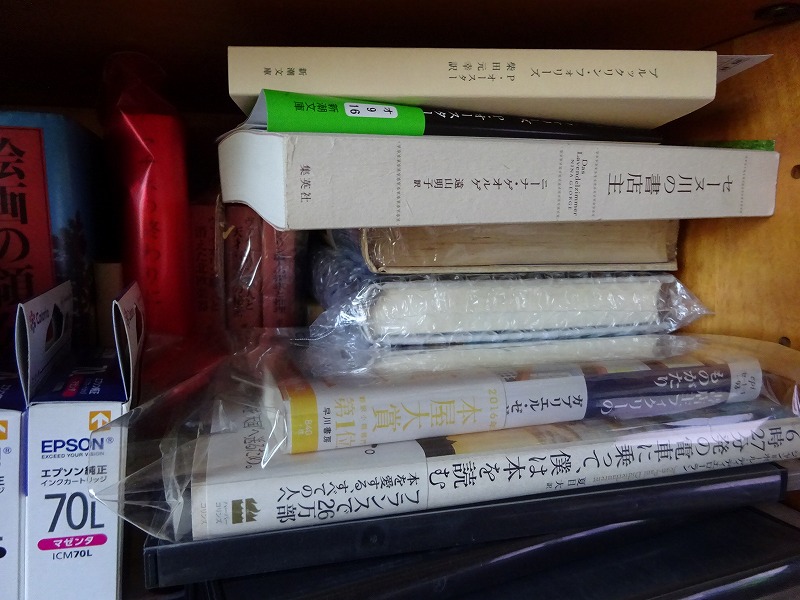 長い事外出できない時には、自分の淀み沈滞した意識を外の世界(空想の世界)に飛ばすことも一時的なストレス解消になる。 ・・・文庫が多いのだが、自室の本棚には既に置き場が無くなりかけている。(本にビニール袋をかけているのは喫煙の為にすぐにヤニで黄ばんでしまう為で、広告などが入って来たビニール袋などを利用している・・・。笑)