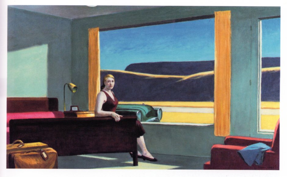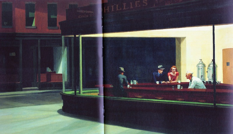 私がこのホッパーの画集を初めて見た時の印象は、「映画の絵コンテ」「これから起こるであろう事件」「孤独で日々をたんたんと生きる人々」 また一部の絵にはステファン・キングのキャッスルロックの様な架空の町の「悲劇の予感」の様なものを感じた。 全く普通の絵でありながら、時間の止まった人気のない暗いバックなどには、ポール・デルヴォーに似たようなアメリカン・シュールレアリズムのモダンアートの雰囲気を感じた。