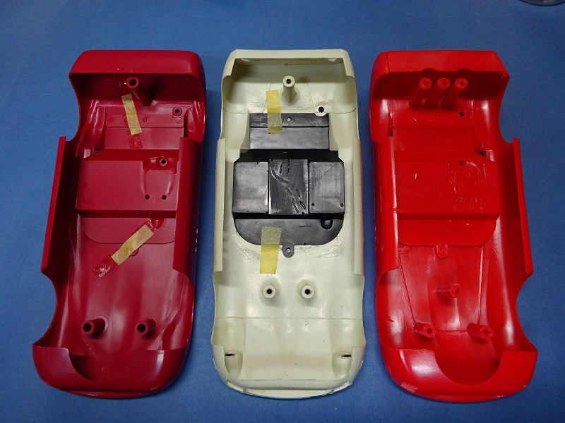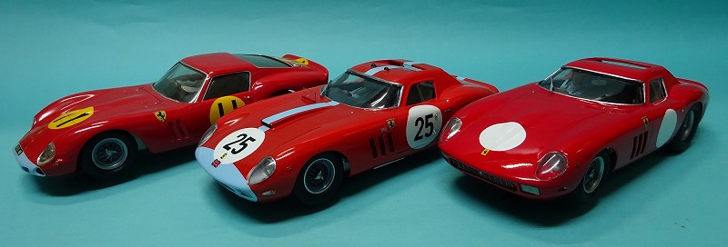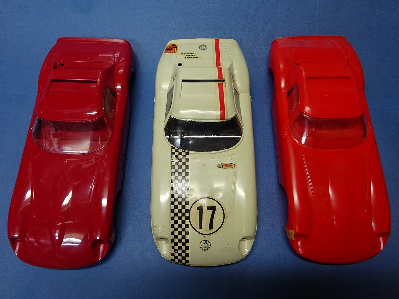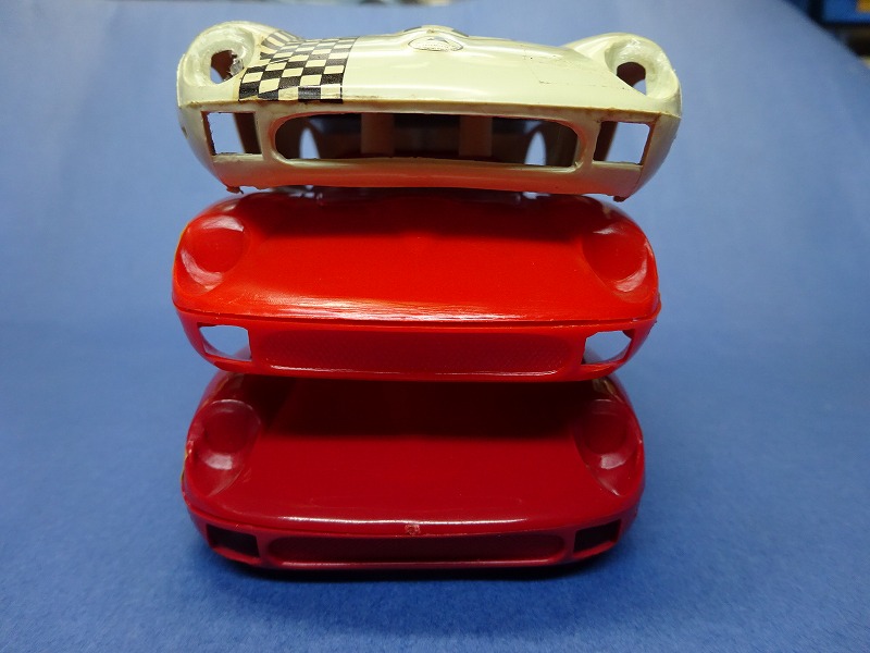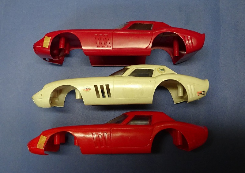 下のGTOはフロントスクリーンが割れて無くなっていた車で、サッシも欠けていたので新たにプラ板(棒)で製作し直している。 スクリーンはバキューム物なのだが、製作したサッシの下部に隙間が少し出来てしまっている。 また2台ともライトカバーを透明レジンでの製作を試みたのだが、レジンに気泡が残ってしまい、あえなく失敗に終わったので急遽バキュームに切り替えたものを付けている。