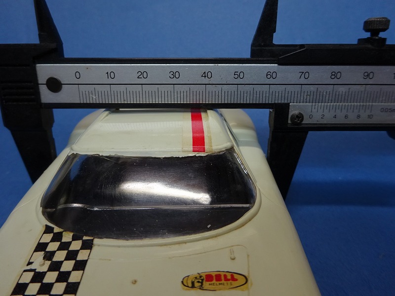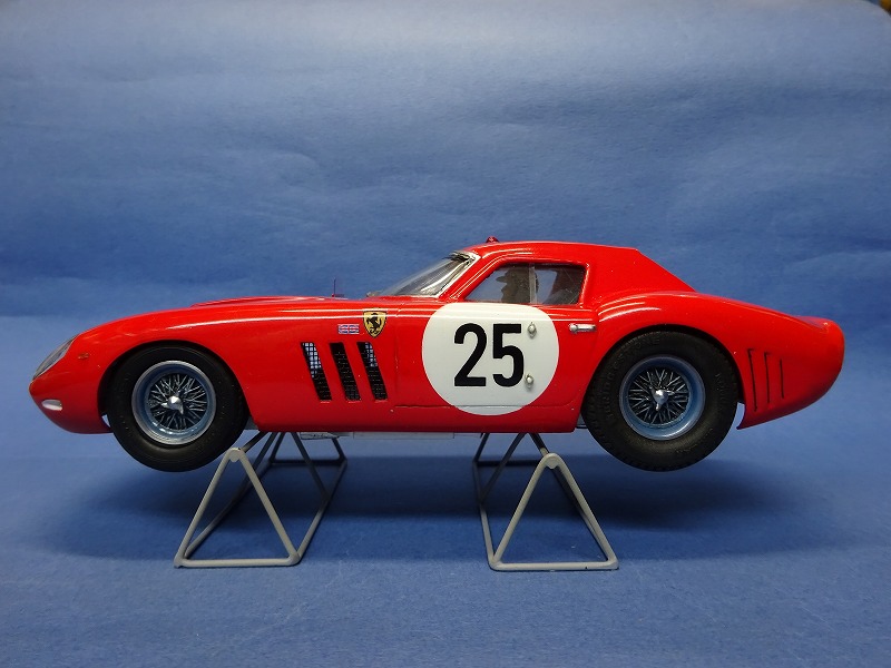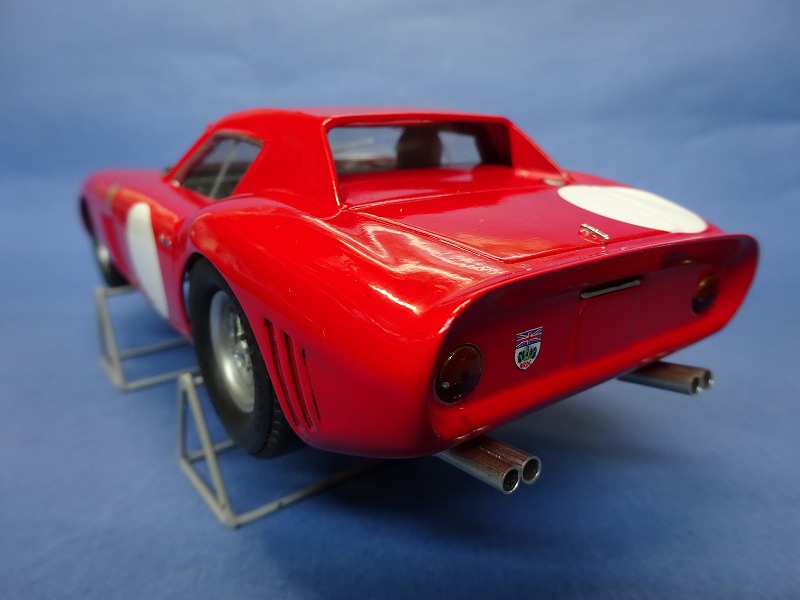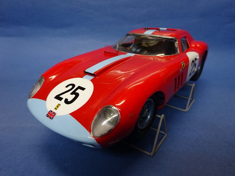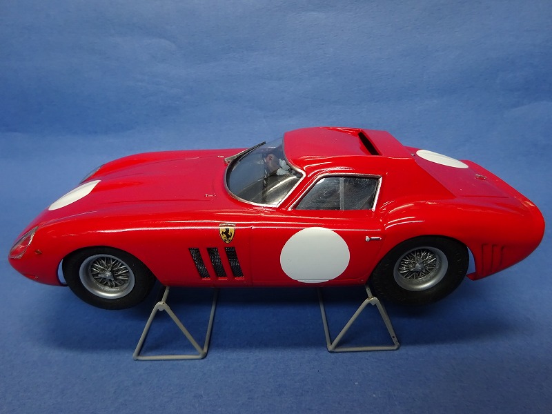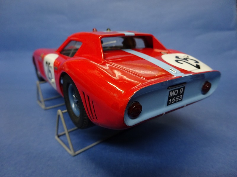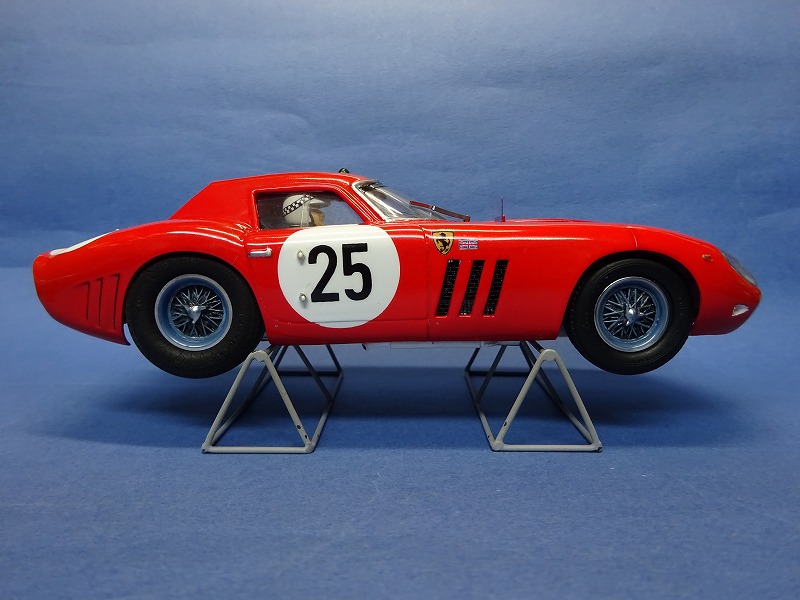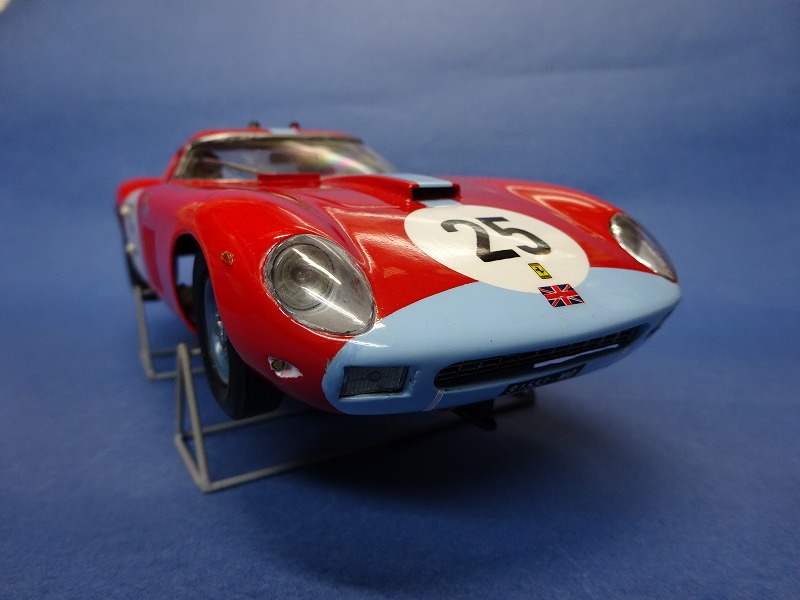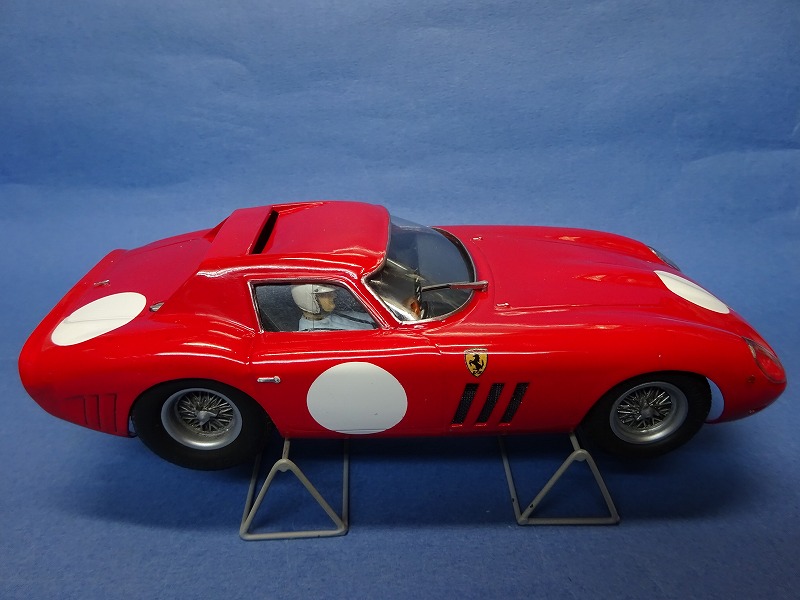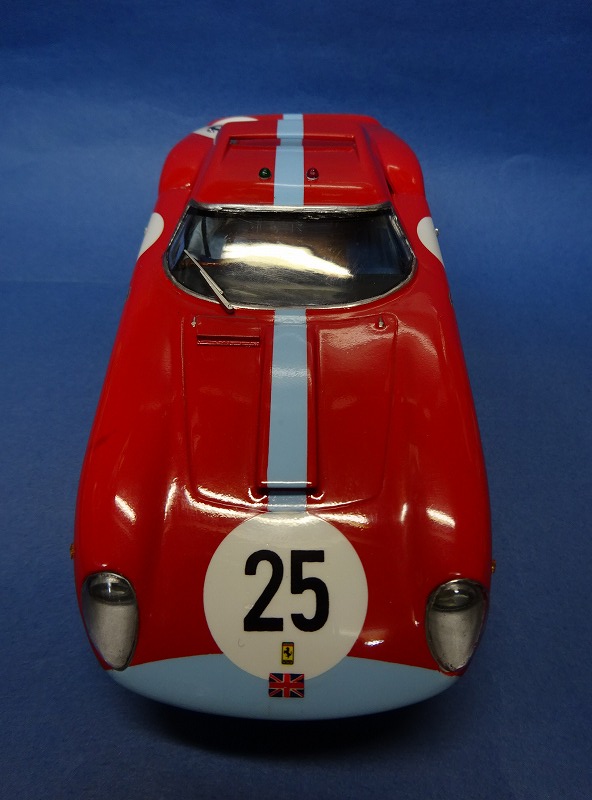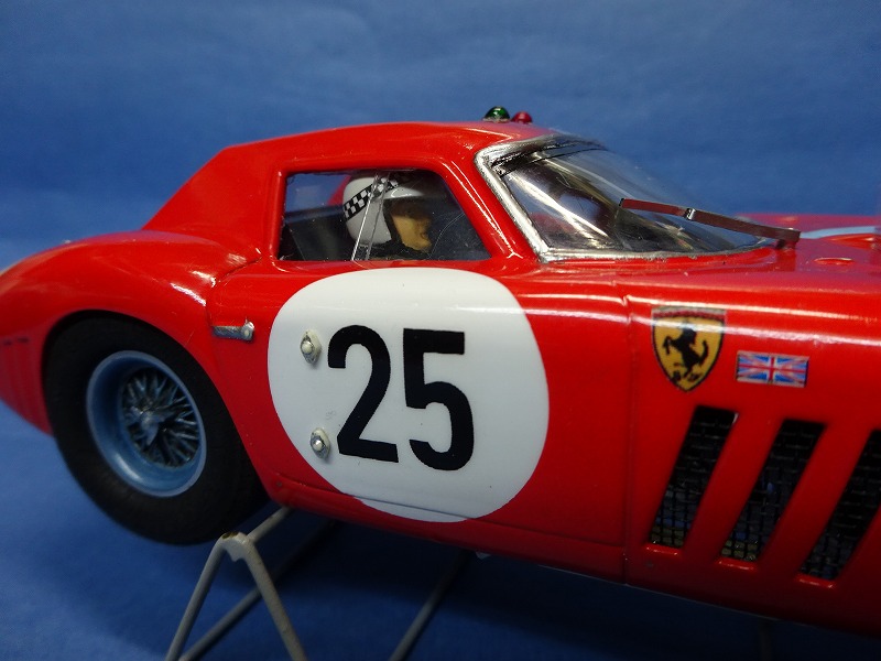 25番のルマンカーはボディーサイドが半分ほど欠損していたボディーだが、とりあえず手持ちのジャンクパーツなどを利用しながらシリーズⅡのGTOの形にどうにかなってくれた。 フロントスクリーンのサッシからはみ出した圧着時のボディーのバリは仕方なく黒の塗装を塗ってごまかしてある。 ただ、手持ちのデカルでは出来なかったイネス・アイルランドのヘルメットのチェッカー模様のデカルは、友人にお願いして作って頂いた物である。