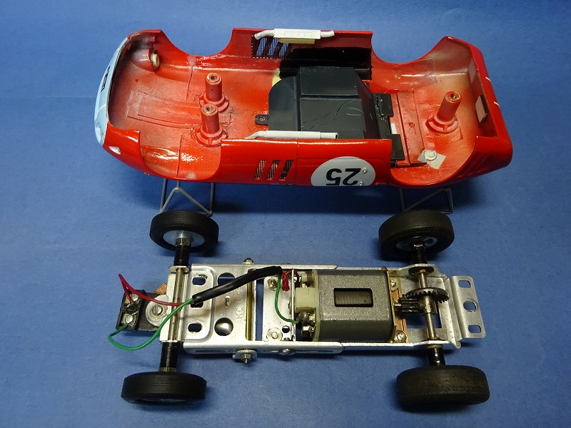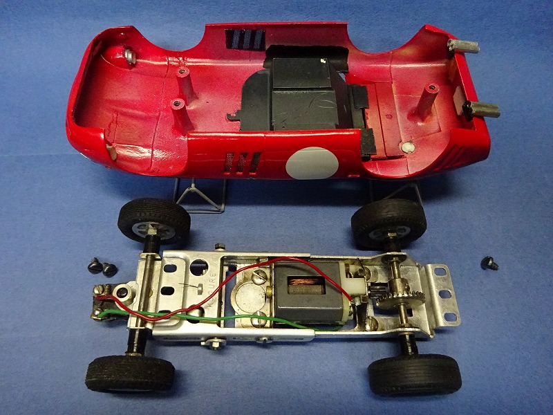 現状ではタイヤは古いコグレのF1用の物が前後に付けてあるだけで、走行時には合いそうなウレタンタイヤに変えなければならない。 シャーシーもモーターマウントを自製しているしポストも無かったので、RMクラフトのポストに変え普通の古いマイナス・ビスで留めている。