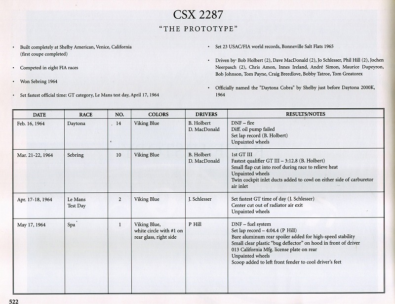 上の資料と写真は「DAYTONA COBRA COUPES」(Peter Brock・ Dave Friedman・ George Stauffer 著)の中から興味深い物を選んでみたのだが、最初のプロトタイプであるCSX2287のオーナーにはスロットカー・メーカーの Rasskit のオーナーであるジム・ラッセルやAutoWorld のオスカー・コバルスキーの名前が見られる。