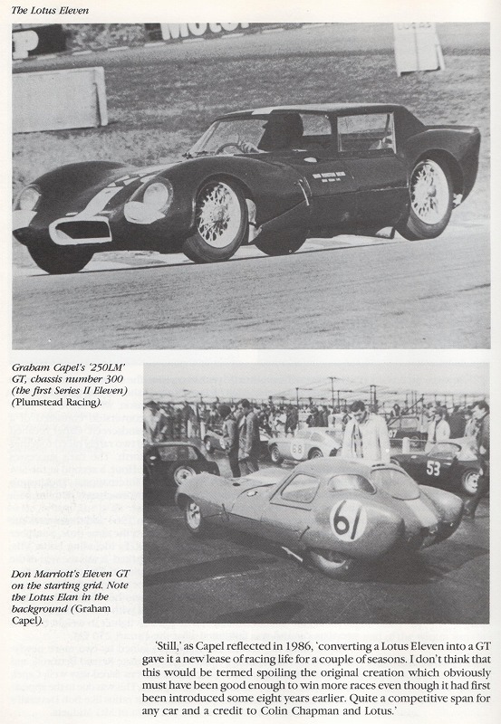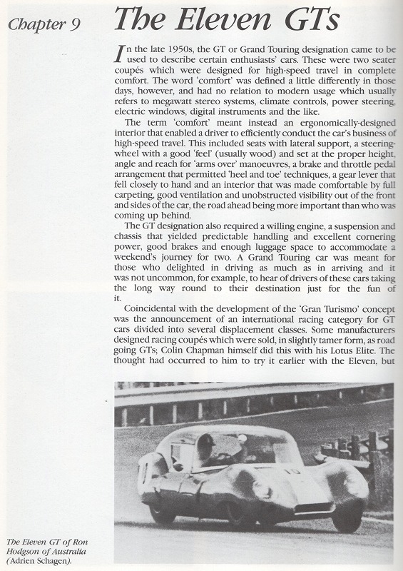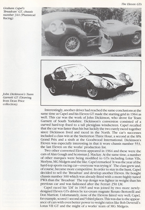 個人的な感想なのだが、50年代後半に中古のイレブンが何台か売りに出されて、それを買った後のレーサーがクーペ(GT)に改造したものが多い様な気がする。 イギリスは1日の内でも天候が変わりやすいので、急に雨が降り出す事も多かったと思う。 そんな時にはクーペの方がドライバーには楽なのだが、車重や空気抵抗等の問題を考えれば、1100cc前後のエンジンにはクーペボディーは荷が重かったのではないだろうか?