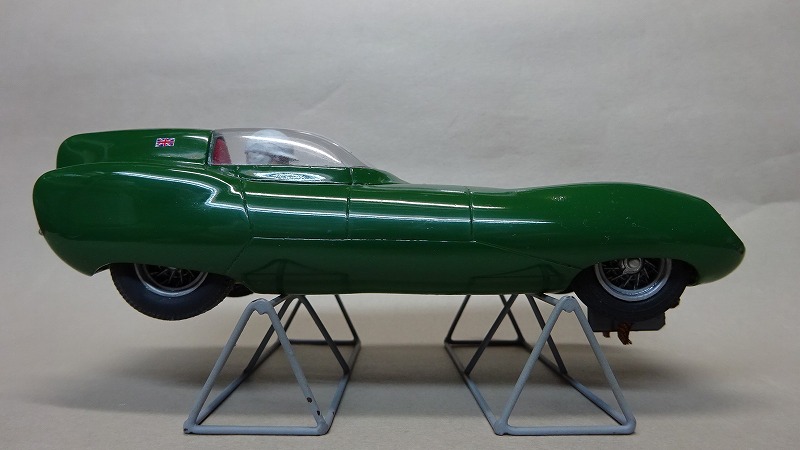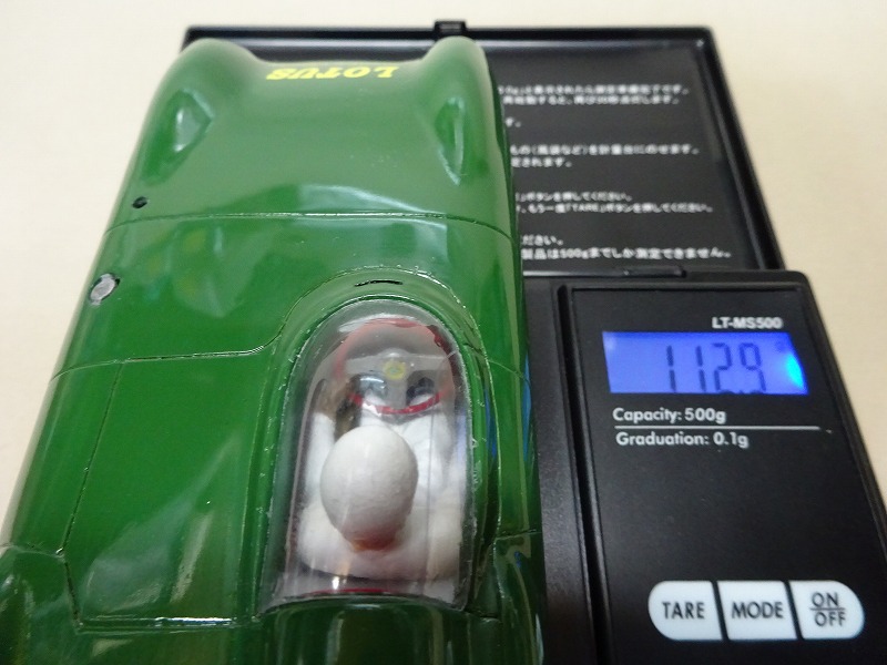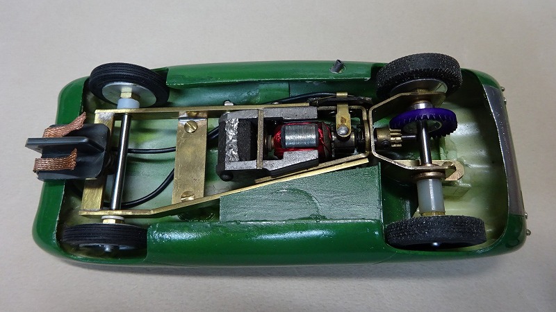 ボディも多少の削りと磨きはしてあるのだが、夜間に他のジャンクと並行してのんびり作っていたので、引っ張り出したりしまったりで、小傷も大分付いてしまっている。 リアのウレタンタイヤは多少出来の悪いもの(気泡あり)が付けてあるのだが、前後とも芯出しは済ませてある。