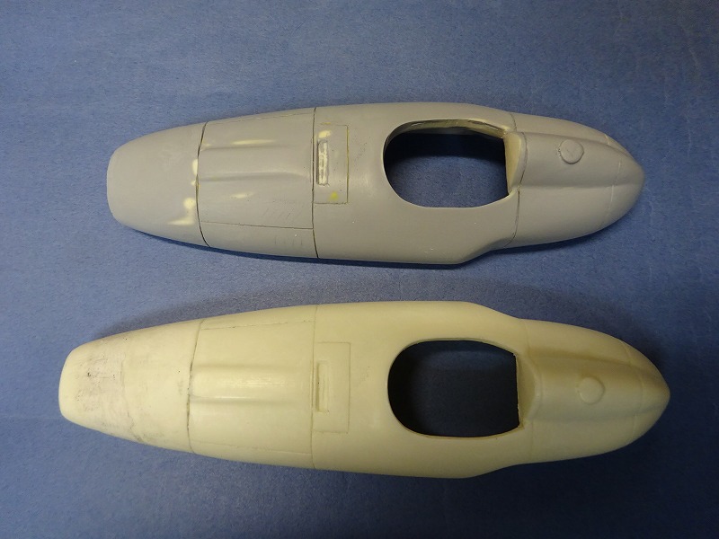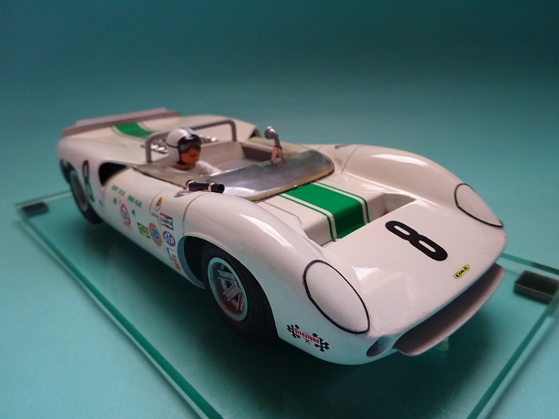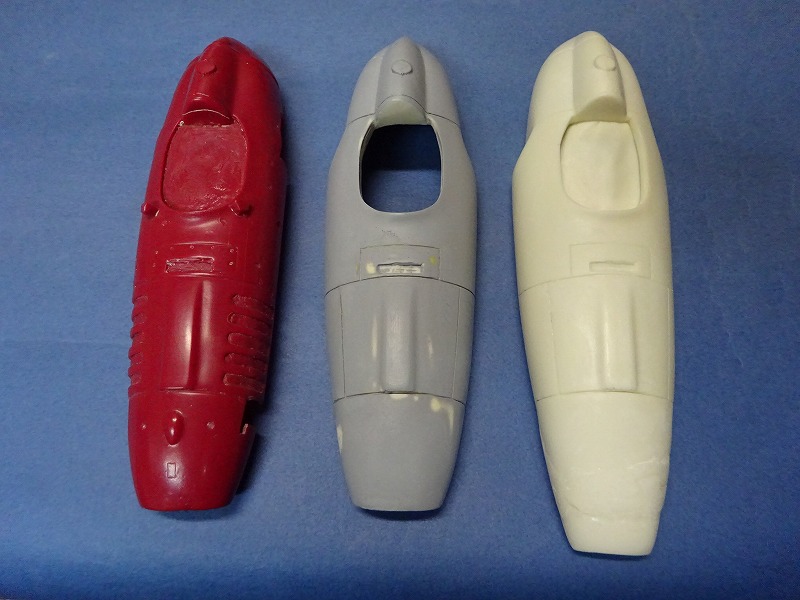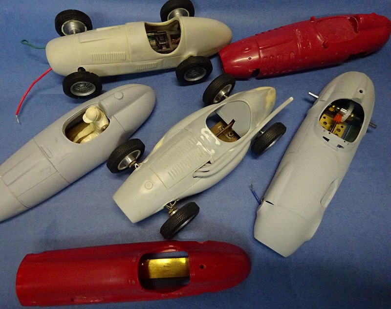 下の写真は古いグラスファイバーのボディーを元に、セパレートタンクのランチャ・フェラーリからD50、ロングノーズの801までの自作レジンボディーを並べたものである。 作りたいと思っている801は、未だにフロントノーズを直しただけで最終的なボディー修正には至っていない。