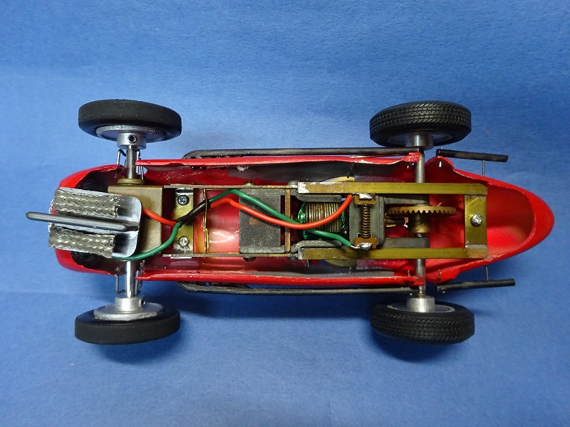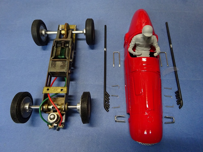 古いレーシング・スクリーンのステーやボンネット上のスプリング・ストラップ、エグゾースト、内装やハンドル等々、殆んどはどうしたものかとボケかけた頭で試行錯誤しながら製作していたので、どれも出来は良くない。 おまけにターゲットにするべき車も決まらず、寒い中を深夜の工作に励んでいただけだ・・・。 そんな訳でとりあえず色は塗ってはみたものの、ゼッケン番号も入れられず、ボディーにもクリアも噴かず、ただただ形にだけした車だ・・・。