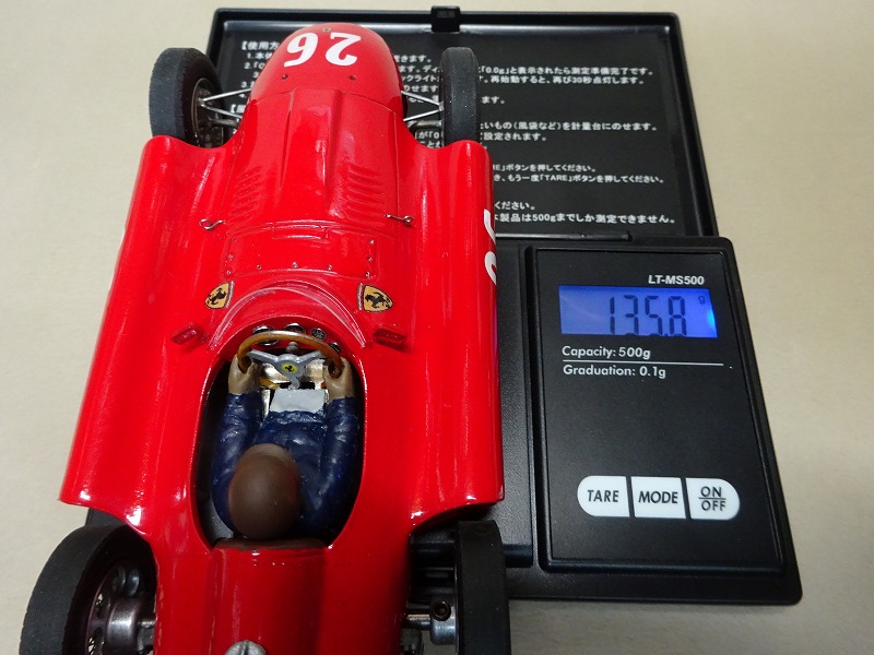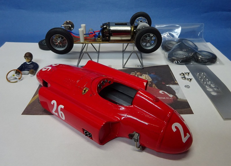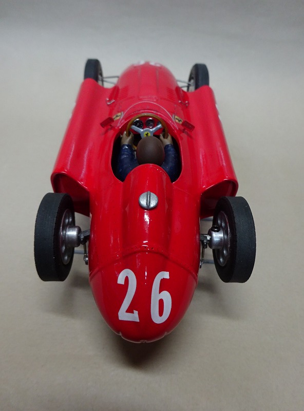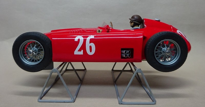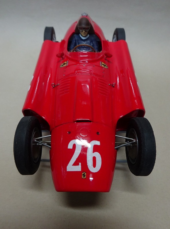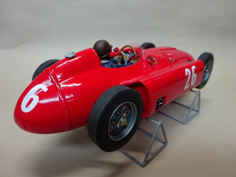 今回製作した車はその時のイタリアGPの前の車で、ゼッケン番号の字体が多少異なるコリンズ車である。 下地のサフェーサーを綺麗にサンディングしないでイタリアン・レッドを吹いてしまったので、相変わらず塗装は綺麗とは云い難い。