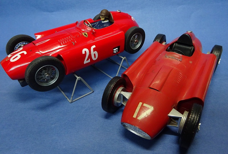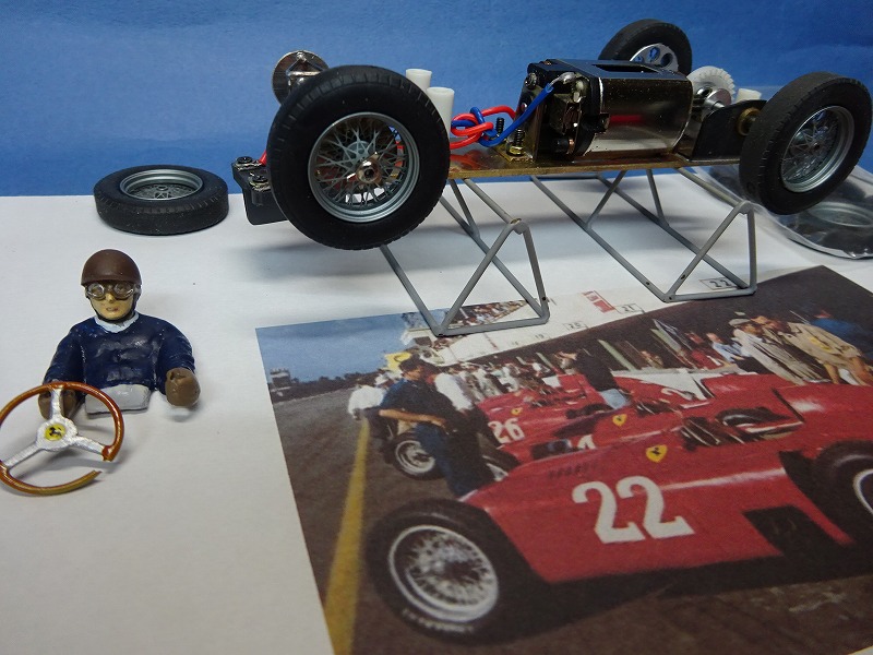 今回製作したフェラーリD50のコリンズ車(#26)にも面白いエピソードが存在する。 ご存じの方も多いと思うのだが、1956年のイタリアGP(最終戦)で#22のファンジオのD50がステアリングトラブルでリタイヤし、急遽このコリンズの車に乗り換えて2位でゴールし、3回目のワールド・チャンピオンシップを獲得したのだ!