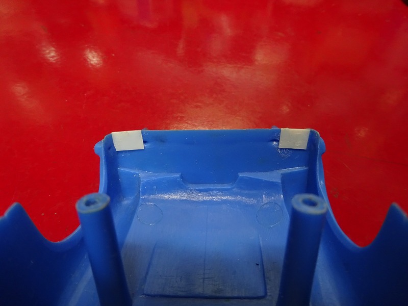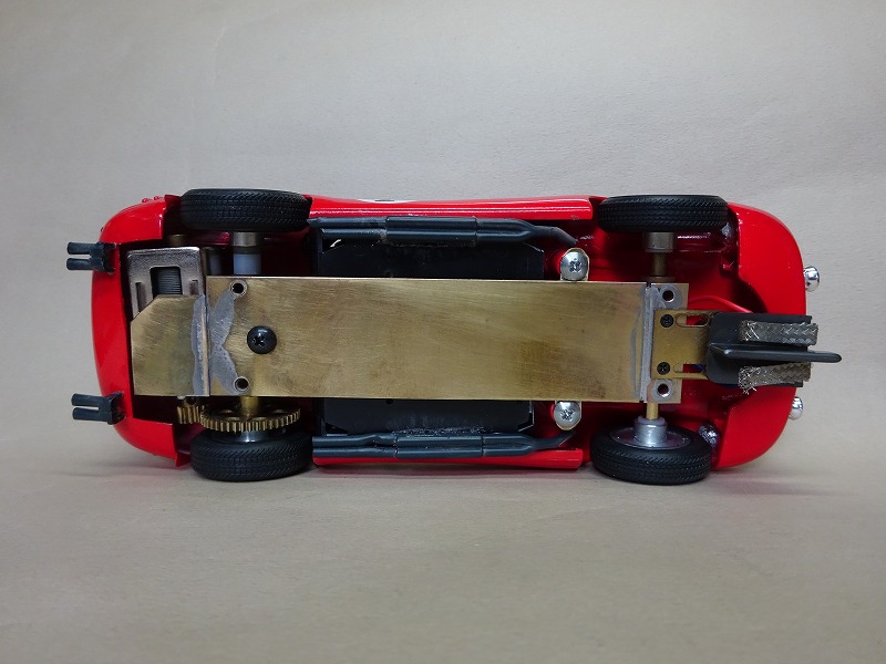 フラットにシャーシーを装着したいのでボディーリア側のポストにはプラパイプを外側から足してスペーサー変わりの高さ調節をしてみた。 FT16の古いモーターが入れば良かったのだが、このリアポスト利用の為にやむなく断念し、現行のモーターを取り付けてみたのだが、これでも一部がポストに当たる始末である・・・。