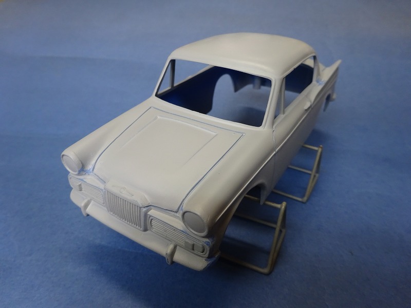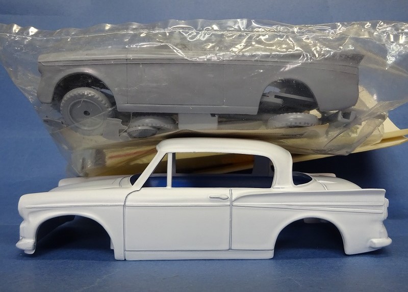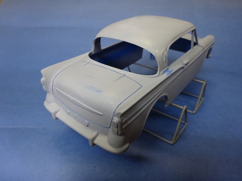 サフェーサーを噴いて簡単なボディーの修正をした段階でそろそろシャーシーを組み立てなければならない。 今回は新しく来た1mm厚のブラス板をいつもと同じ様にジグゾーで切り出しフレームに使っている。 ・・・今回の車は小さいので、板材は5枚一組(1x50x100mm)の切り出された小さめの真鍮板を使用してみた。
