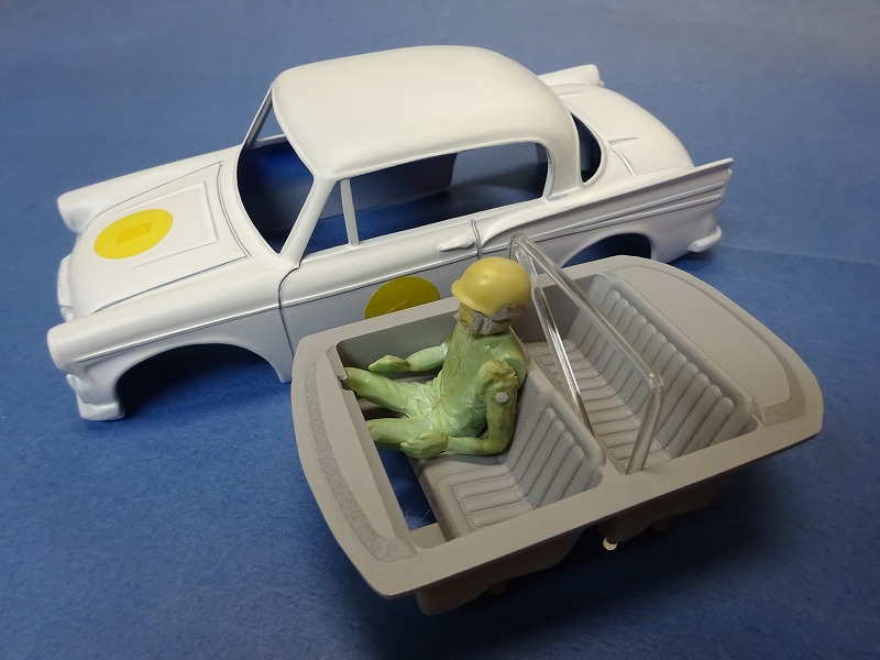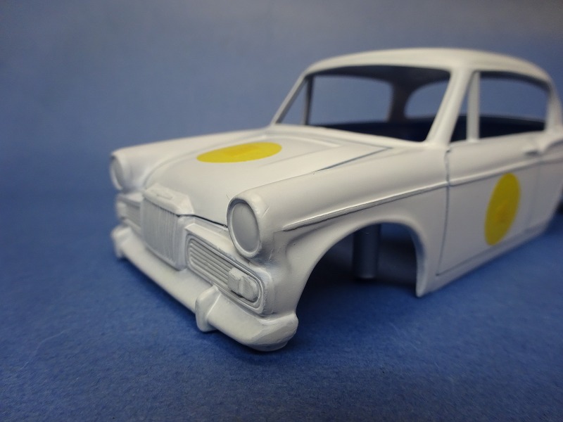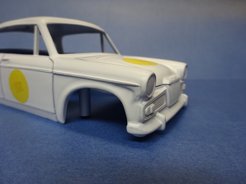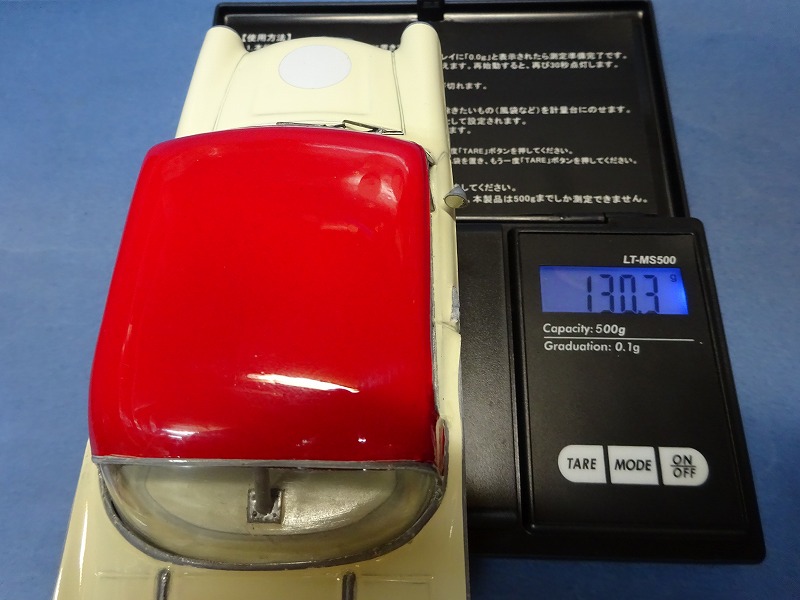 ・・・おまけに小箱の中を見るとこの車に合いそうなプラモのホイルもさがしだしてあるし、第一、ボディーを私が大分いじっていることが判る。 私の好きな車だったのだが当時のクラブレースには出られない車種だった。 ・・・すでに大分ボディーの整形も進んでいる。