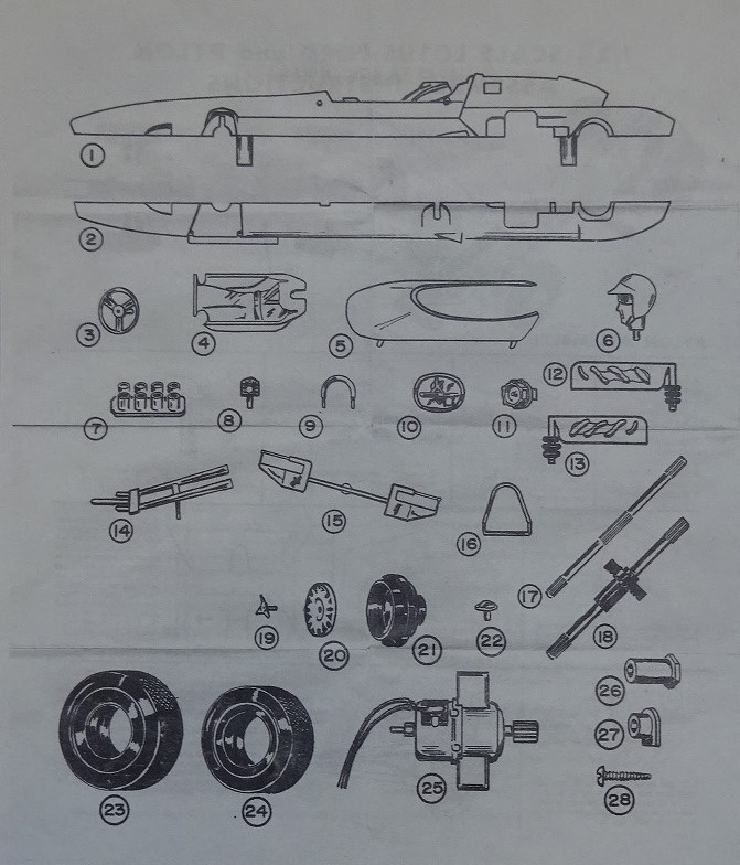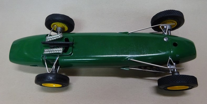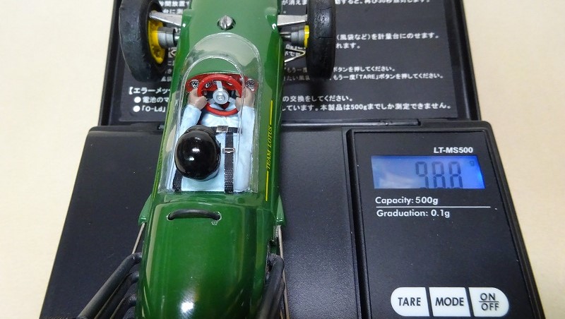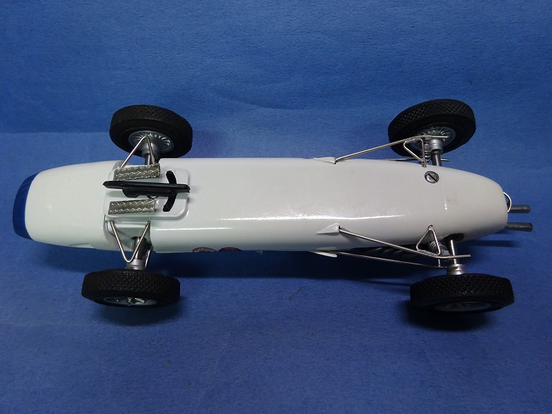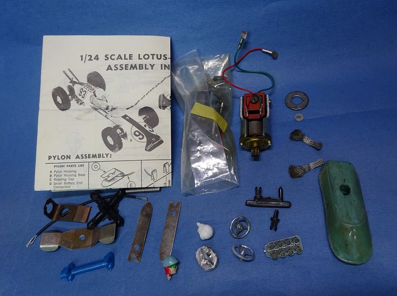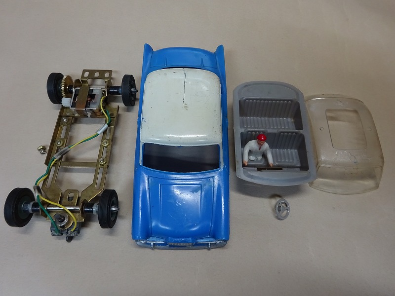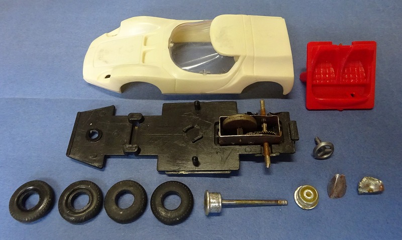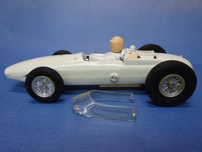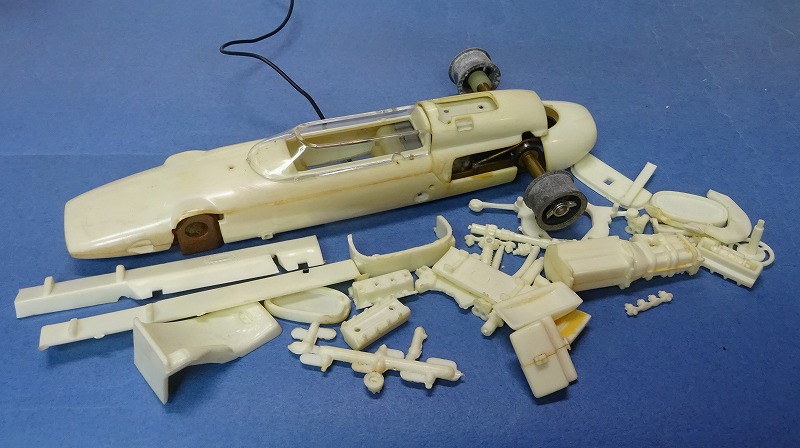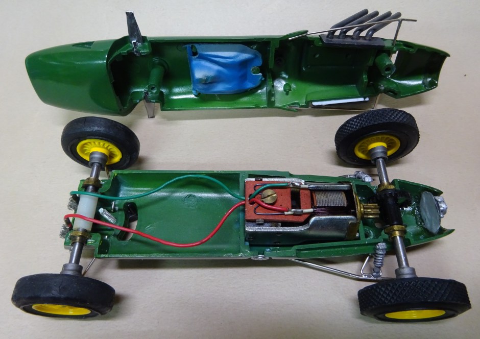 アルミフレームもワンピースの物だし、モーター(FT16)の取り付け方もあまりにもファジーだ。 ドライバーの着座姿勢を見ても60年代初頭のプラモの様で、65年当時の初期の他社のスロットカー・キットの物とはリアリティーという点から見れば大分違う様だ・・・。
